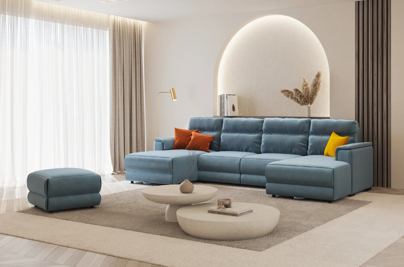 Piesa centrală a colecției, colțarul modular Avalon, oferă libertate deplină de configurare, putând fi adaptat cu ușurință în mai multe variante – de la combinații compacte, până la configurații ample, în formă de U. Sistemul modular permite integrarea unui șezlong alături de o canapea extensibilă de 2, 3 sau 4 locuri, cu posibilitatea adăugării unui fotoliu sau păstrarea unei variante minimaliste. În plus, colțarele sunt prevăzute cu lăzi de depozitare generoase, ușor de accesat, ideale pentru organizarea eficientă a spațiului.